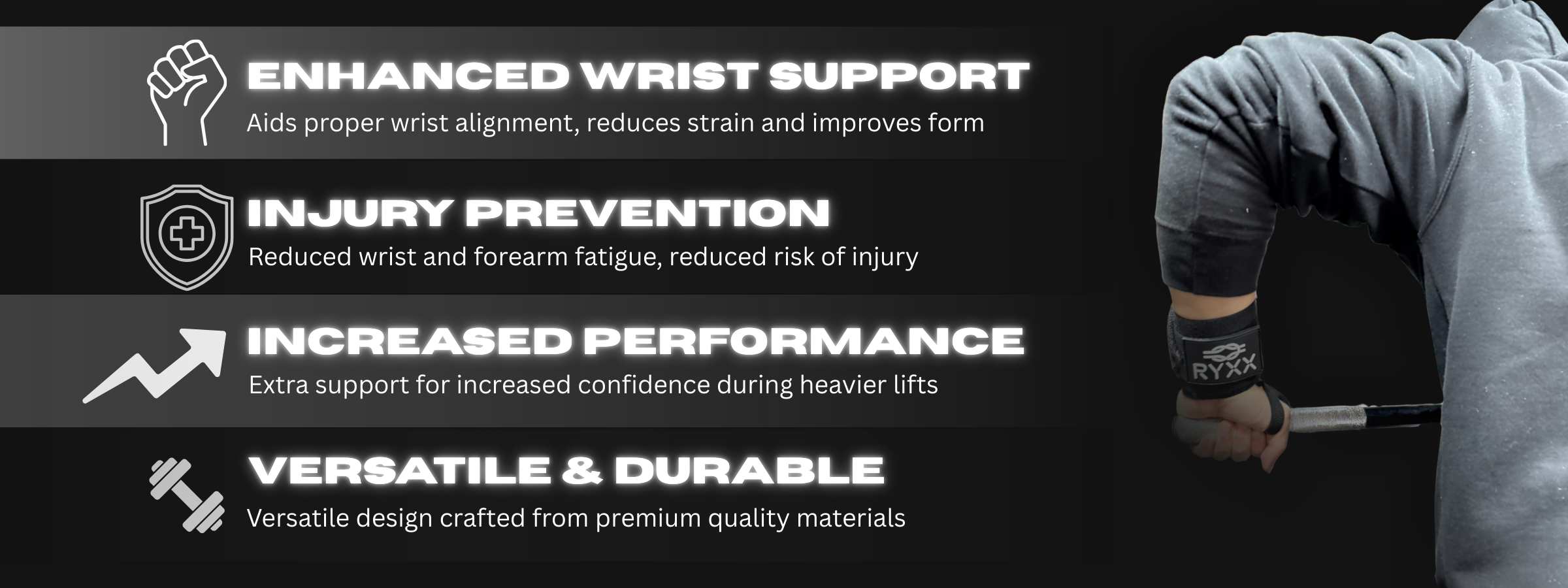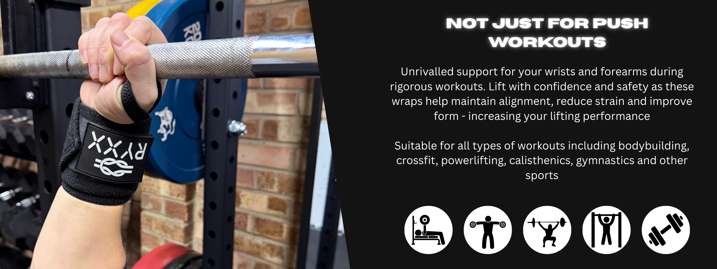 Solid support without feeling restrictive. These RYXX wrist wraps are comfortable, easy to adjust, and stay locked in during heavy lifts.